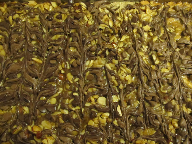 Toffee layer- combine butter and brown sugar in a sauce pan over medium heat. Cook, stirring constantly, until the entire surface boils. Boil 1 minute. Pour over crust and bake at 350 degrees for 22 minutes until golden brown and bubbly. Do not under bake as this will result in a chewy rather than crunchy consistency.